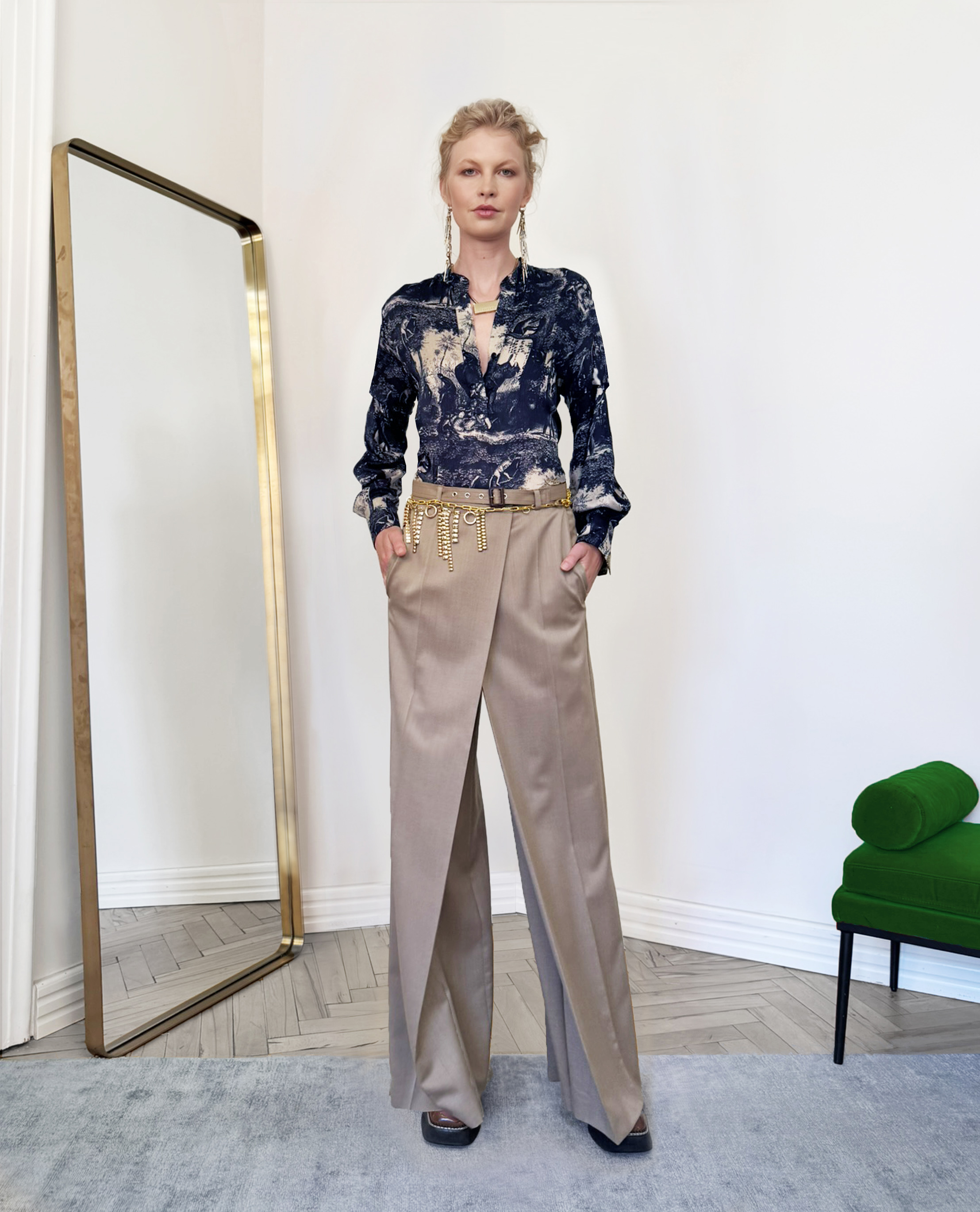 DETAILY: Kalhoty s vysokým pasem a architektonicky řešeným předním záhybem, který vytváří elegantní pohyb při chůzi.