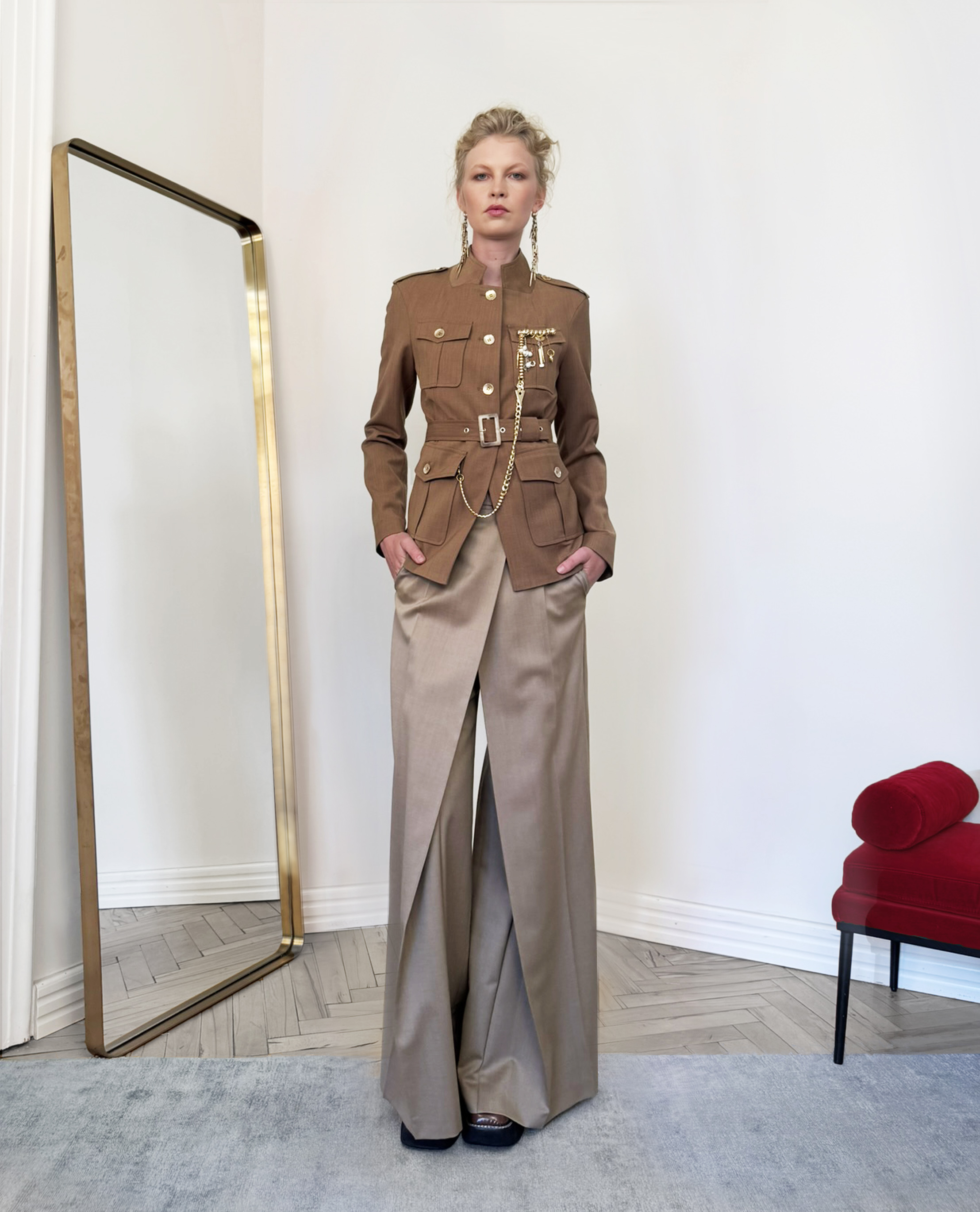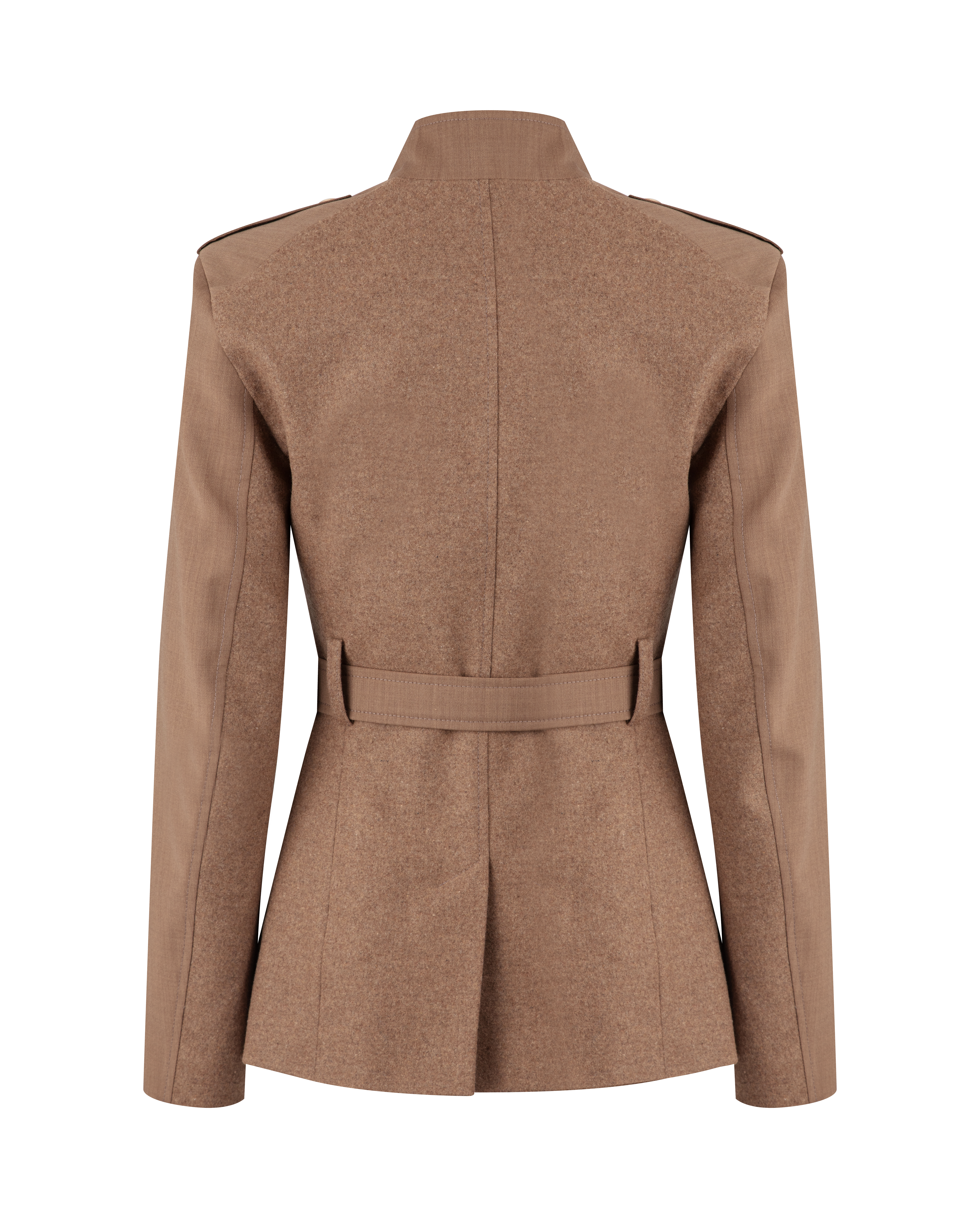 DETAILS: Tailored fitted silhouette with a belt that softly defines the waist. Four pockets and decorative buttons ispired by classic military tailoring. The back panel is made from different smooth fabric, adding subtle contrast and comfort thanks to gentle esasticity. Fully lined