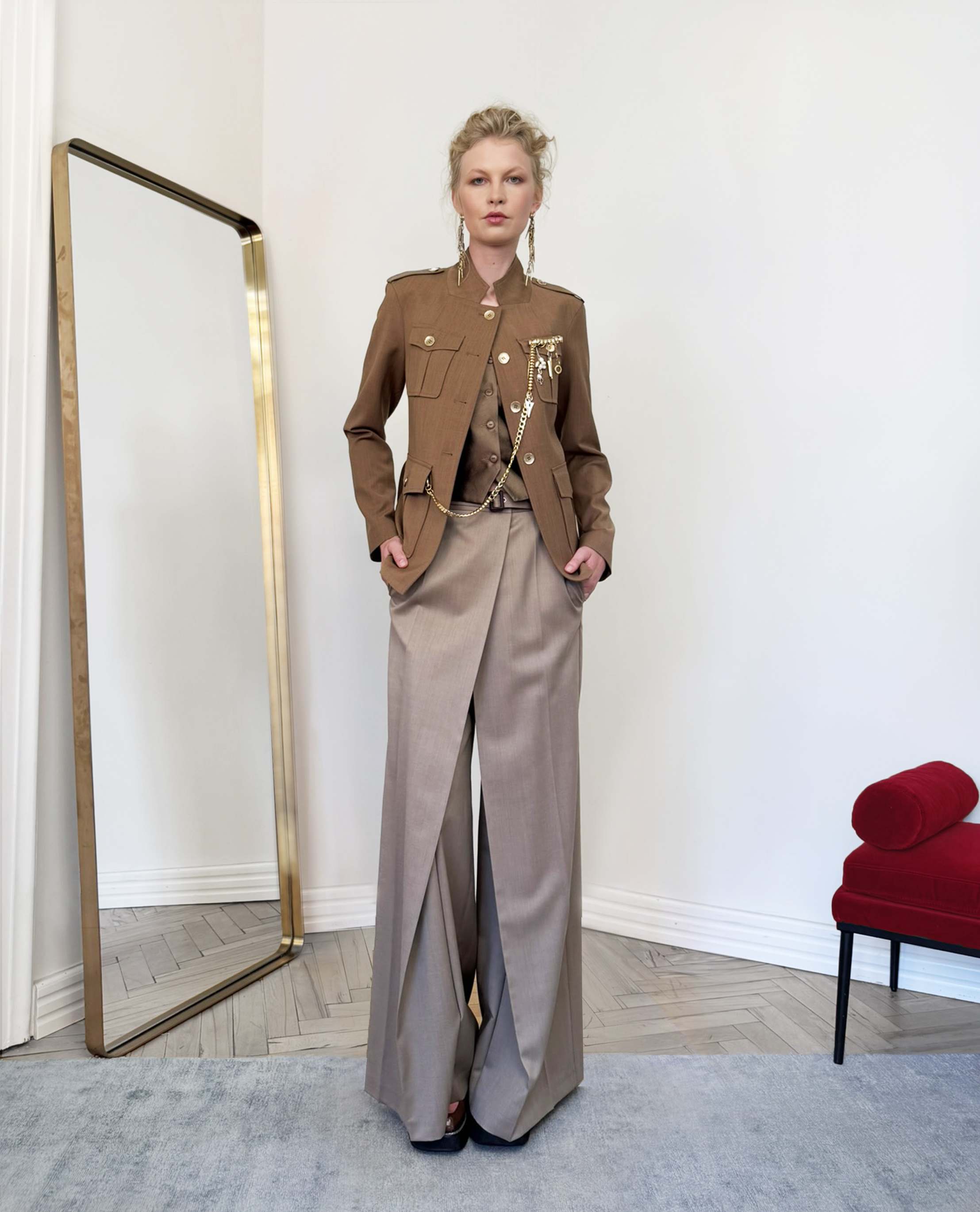 Strukturované sako s páskem, který jemně zvýrazňuje pas a vytváří elegantní siluetu. Výrazné kapsy a dekorativní knoflíky dodávají modelu sofistikovaný charakter inspirovaný military stylem. Záda jsou z jiného, podobného materiálu, který modelu přidává hloubku a originalitu.
