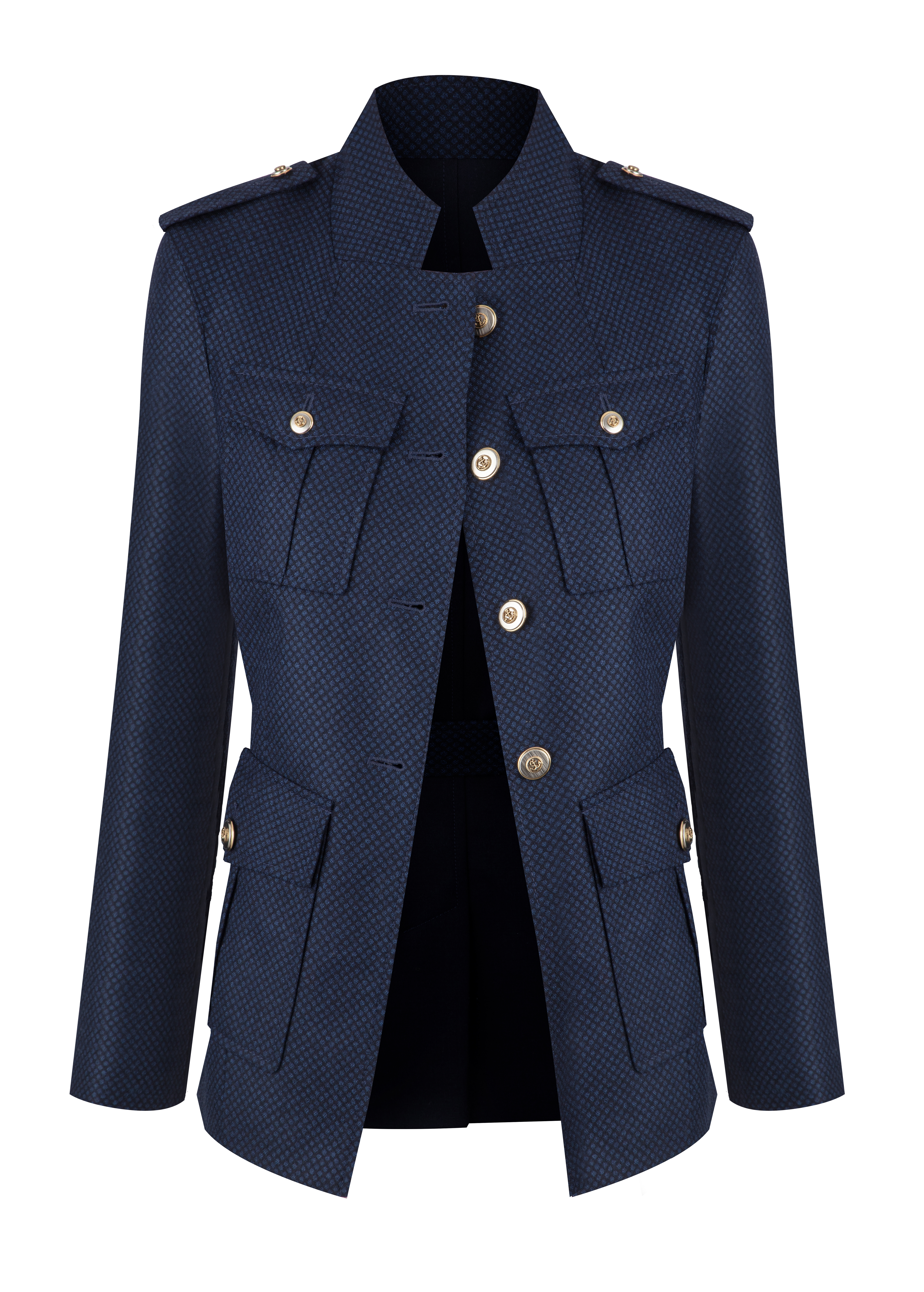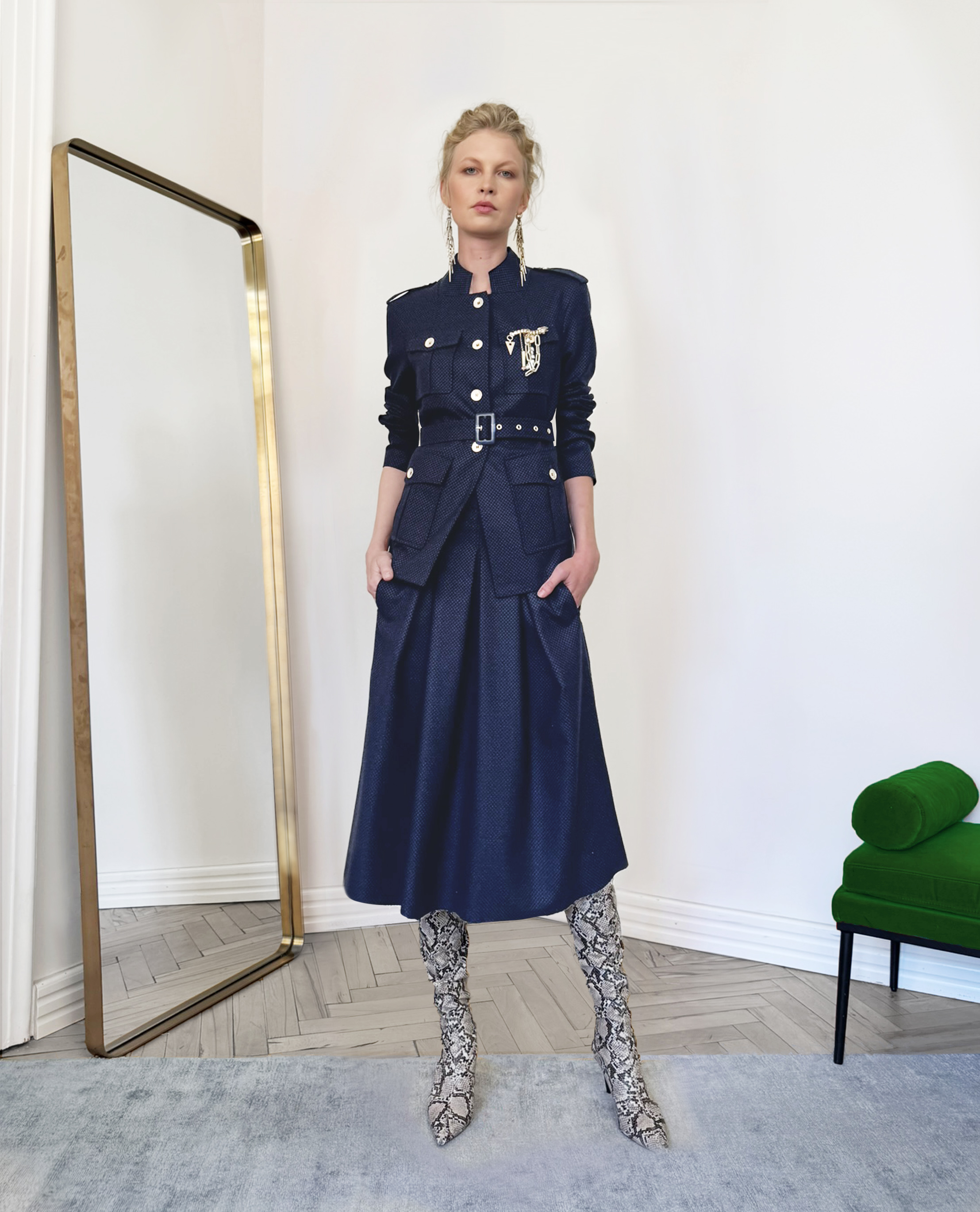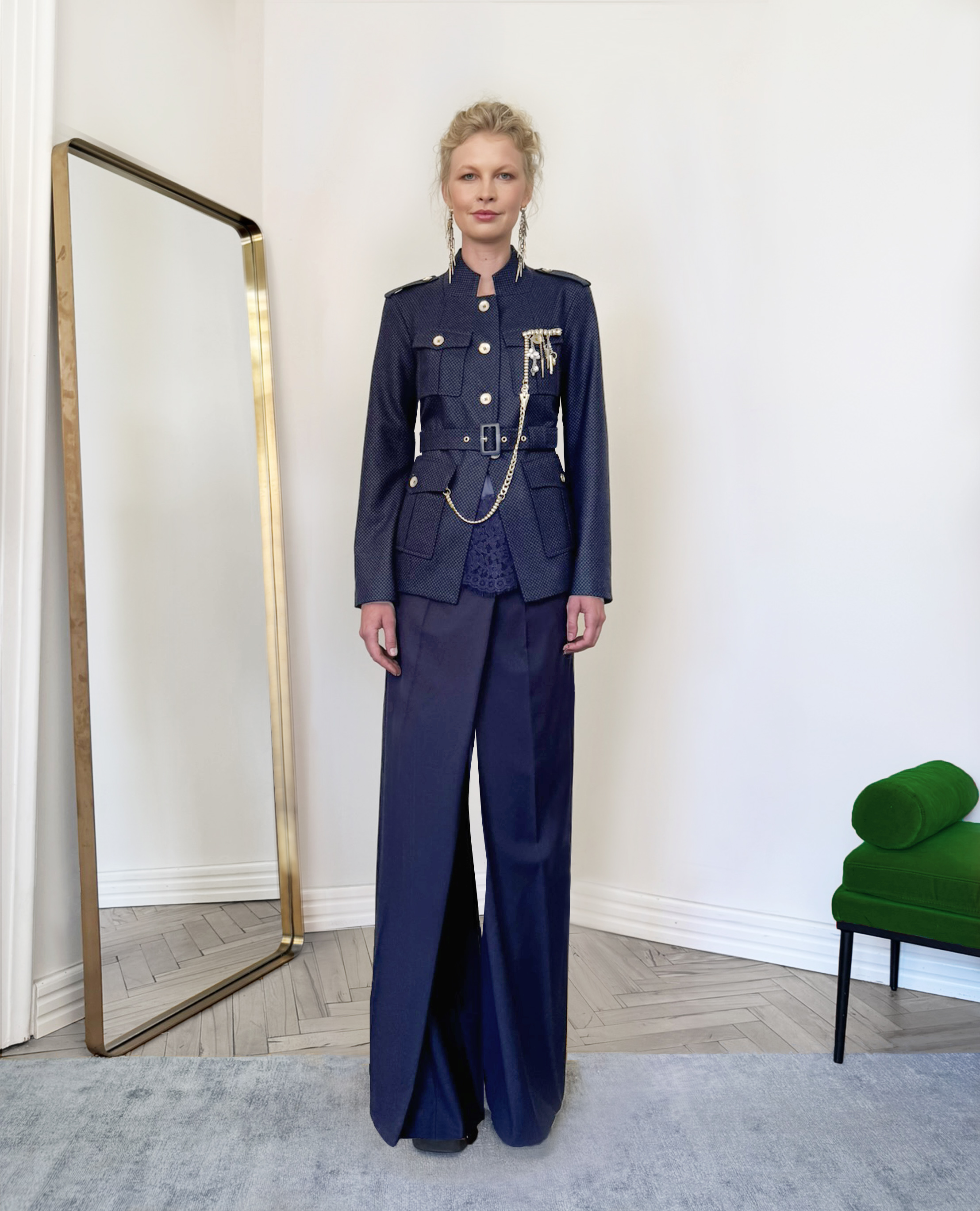 Strukturované sako s páskem, který jemně zvýrazňuje pas a vytváří elegantní siluetu. Výrazné kapsy a dekorativní knoflíky dodávají modelu sofistikovaný charakter inspirovaný military stylem. Záda jsou z jiného, podobného materiálu, který modelu přidává hloubku a originalitu.
